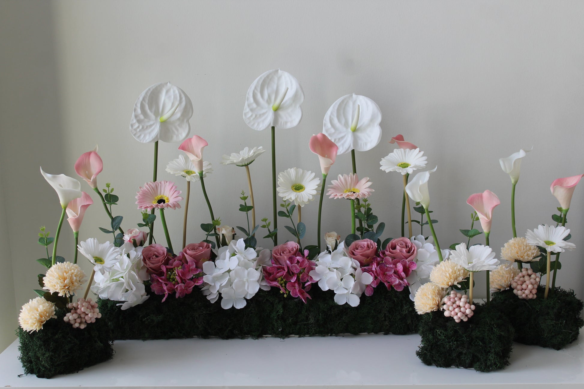 Each bloom — from the luxurious white anthurium to the delicate pink calla lilies, hydrangeas, gerberas, and lavender roses — is carefully placed to tell a story of grace, celebration, and timeless sophistication.